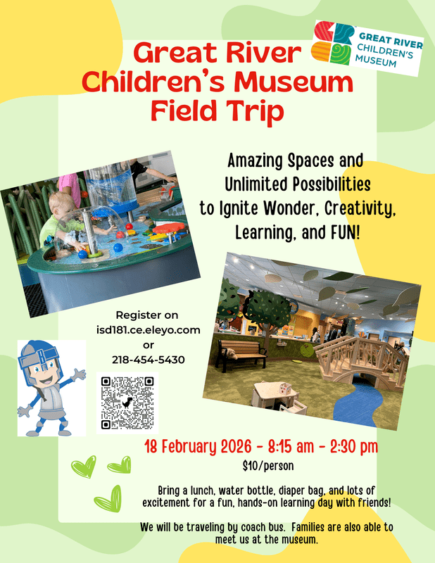Come with your family to enjoy the Great River Children's Museum in St. Cloud! You can ride a coach bus with our ECFE staff or meet us there! Please pack your own lunch.